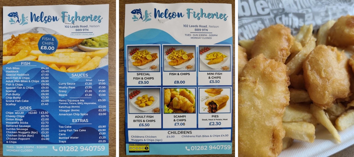Wow 5 stars all round brilliant chippy brilliant fish plus scraps , fish was huge to much food for £18 but next time as we are in our 60 we could quite easily share one fish and chips btw us . But the best fish and chips in Nelson and certainly better than the park chippy offers